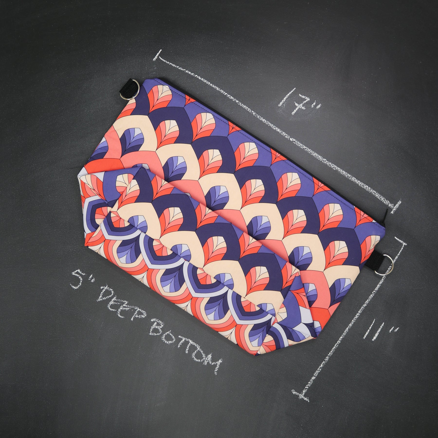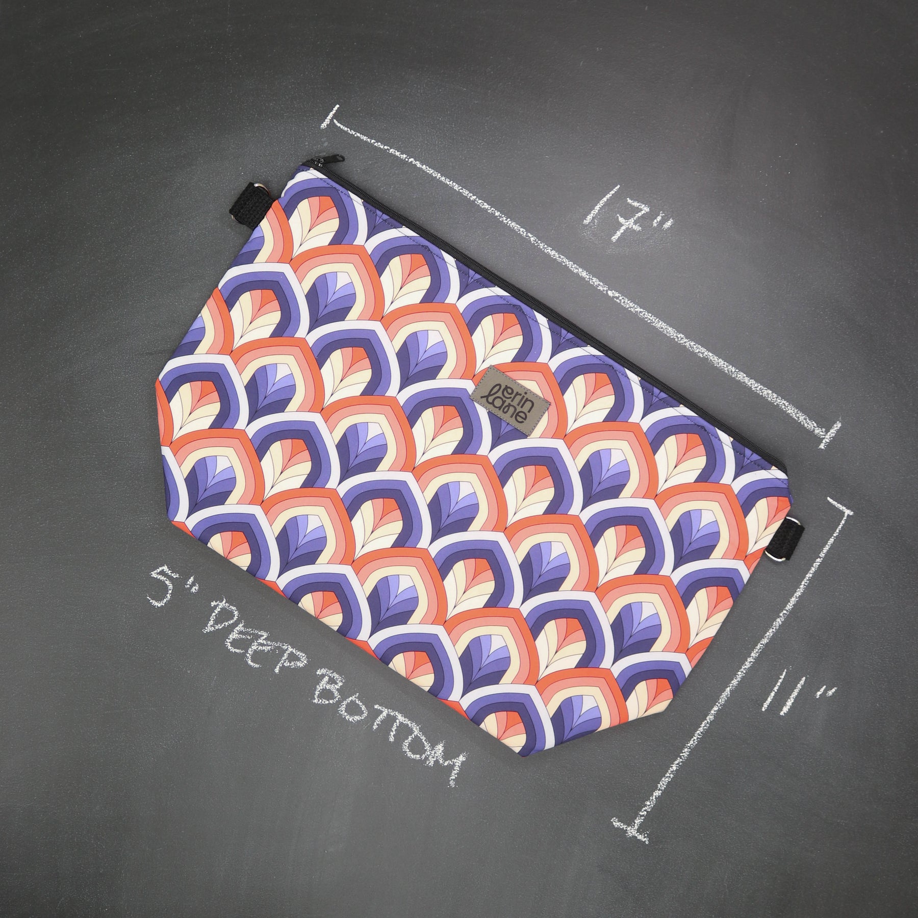Measuring 17" wide, 10" tall, and 5" deep, it easily holds up to 1100g of yarn or everything you need for a day on the go, from your wallet and water bottle to snacks, notebooks, or a Kindle. The fully zippered top keeps everything secure, while the light-colored interior helps you find what you’re looking for without digging.