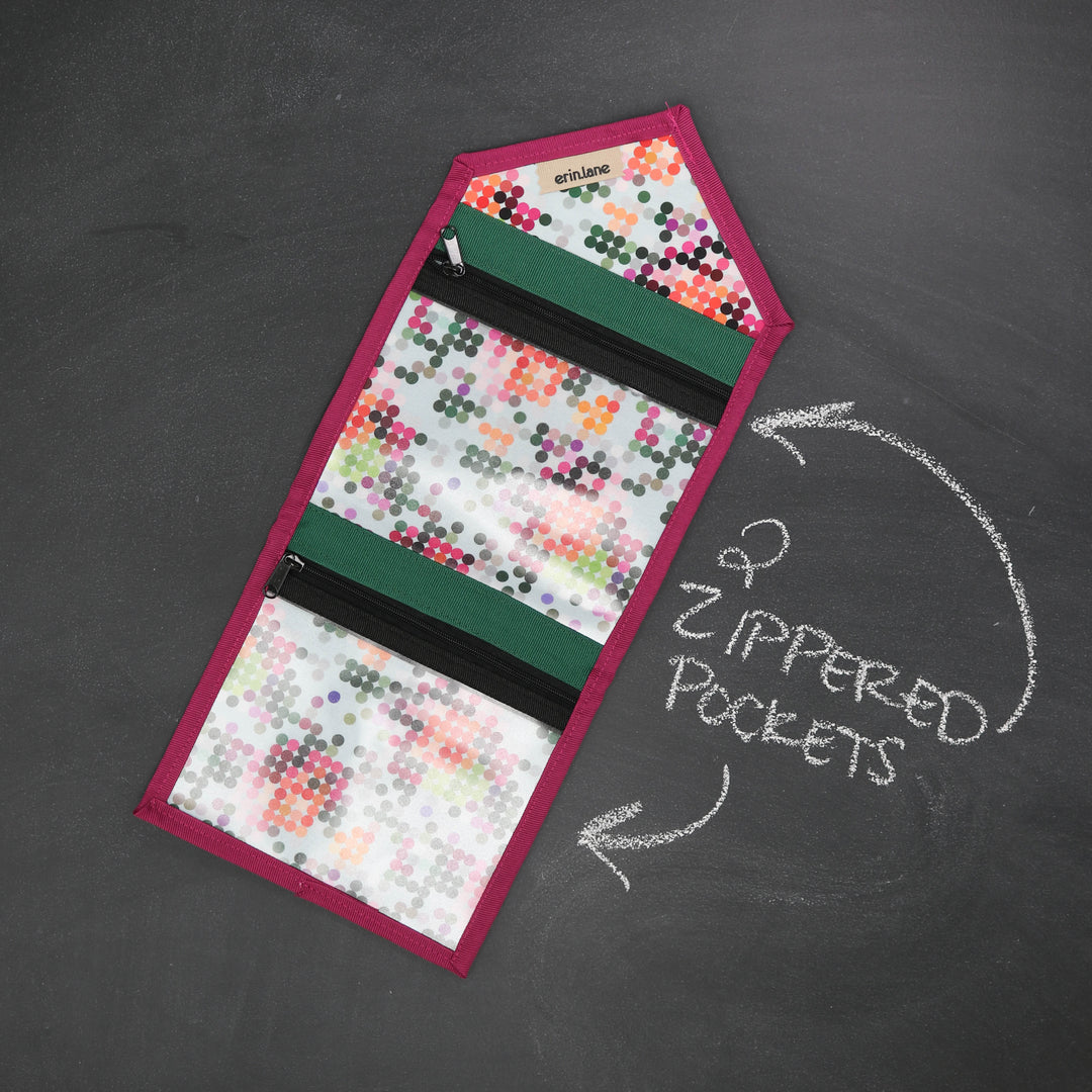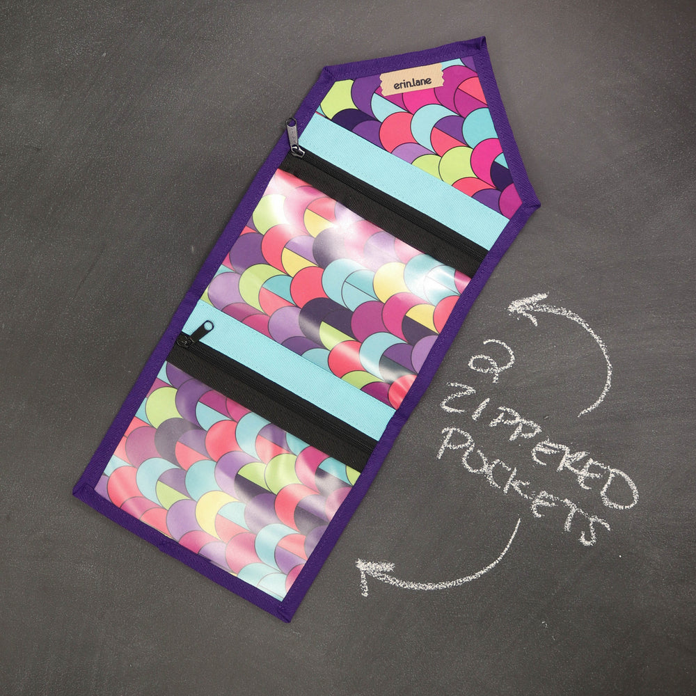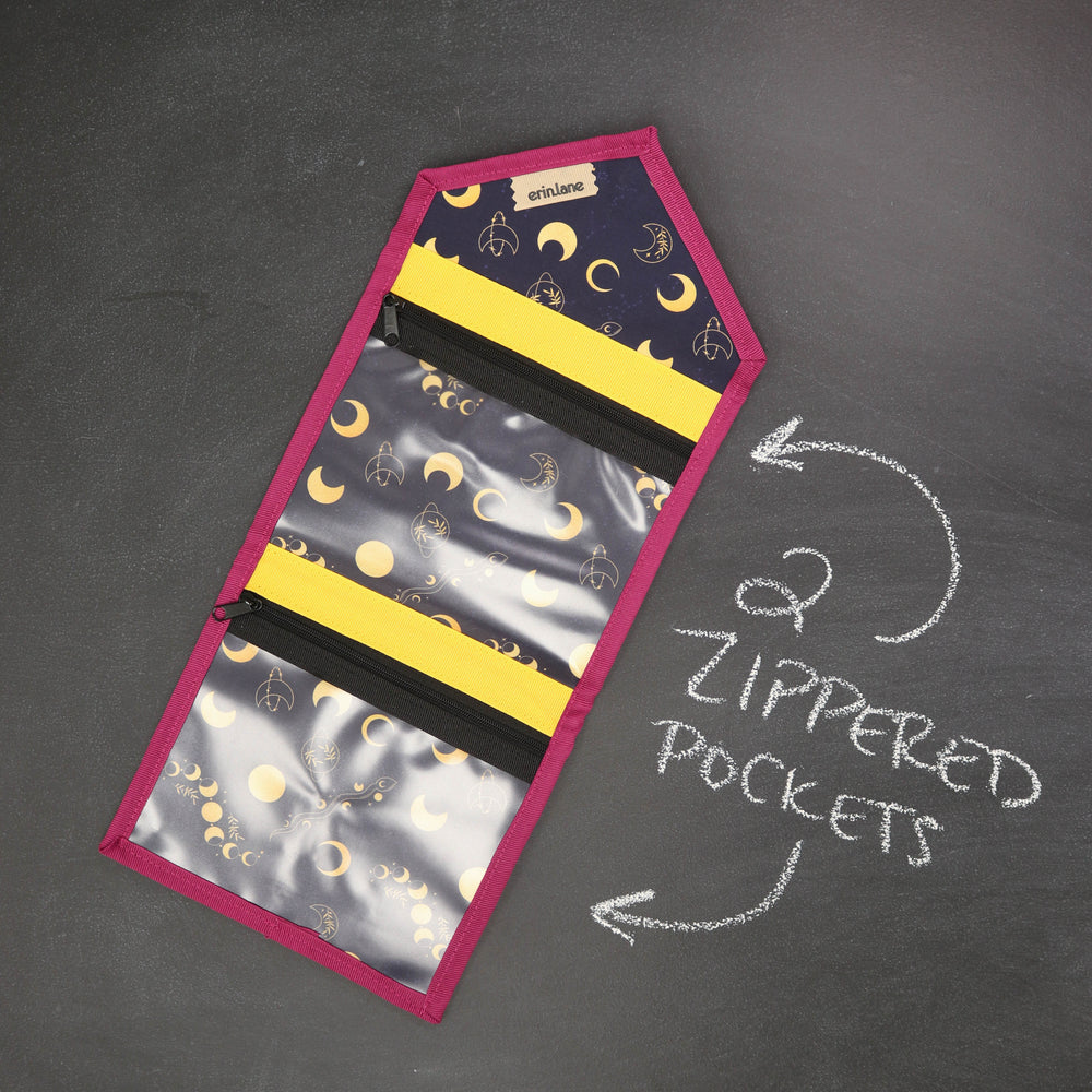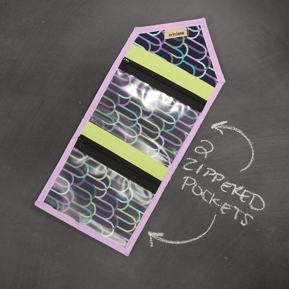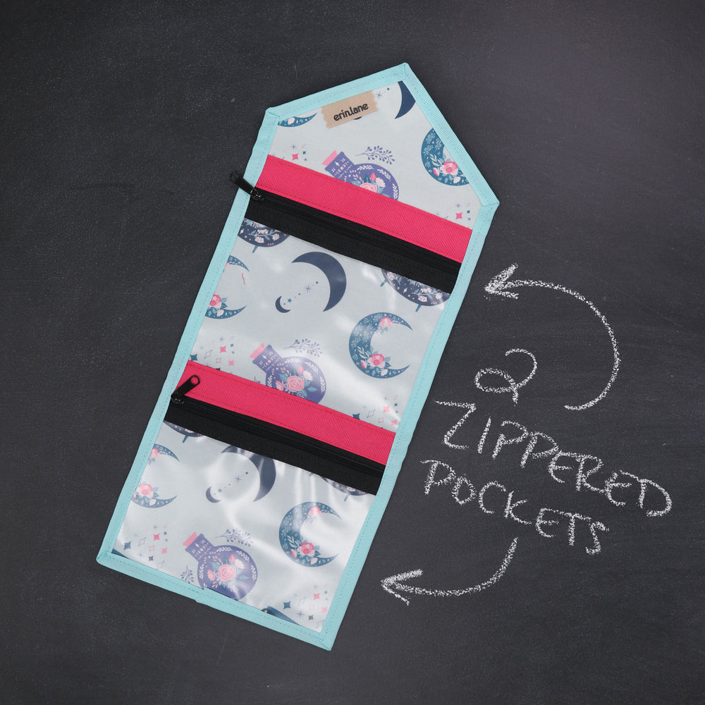 Tame the tools you are always searching for in the bottom of your bag. The KNITPack Notions has two vinyl zippered pockets for all your notions and stitch markers. No need to worry if your notions are bulky, the adjustable magnetic closure makes sure to keep your notions safe even if it's super full.
