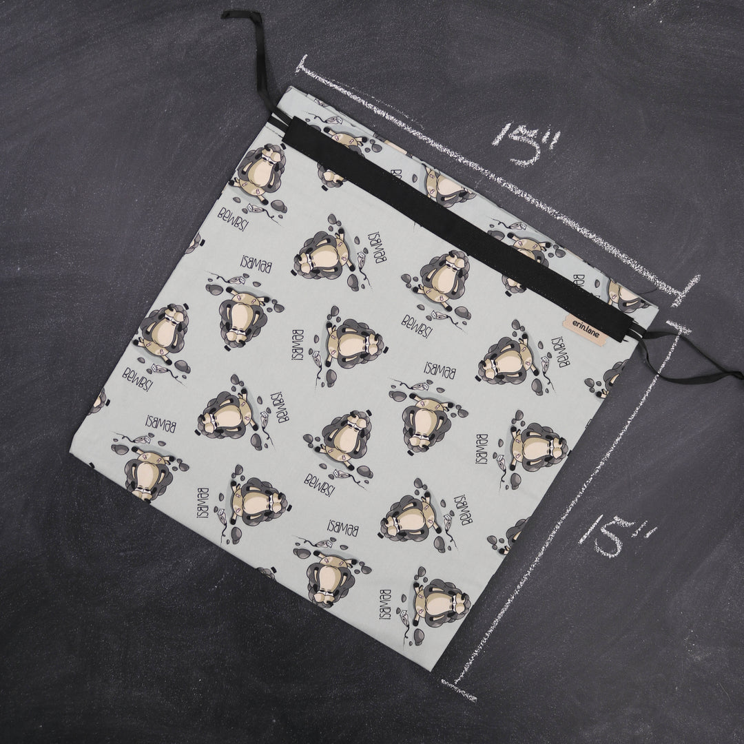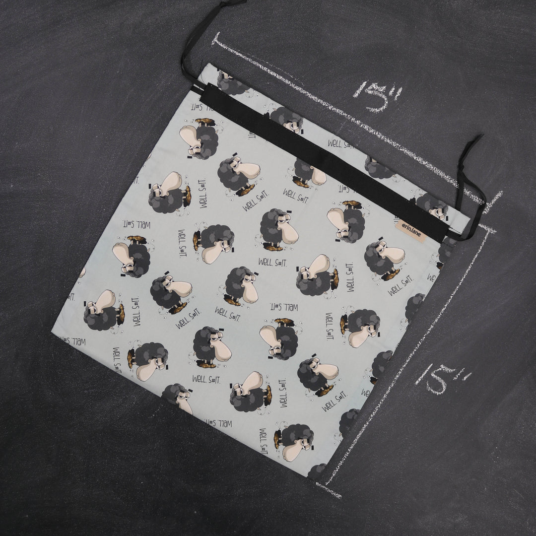 15 X 15 inch flat fold bag fully lined and self-locking drawstring. Perfect for bulky projects, large shawls, small sweaters or crop tops, storing finished garments, and, of course, keeping your project safe and secure.