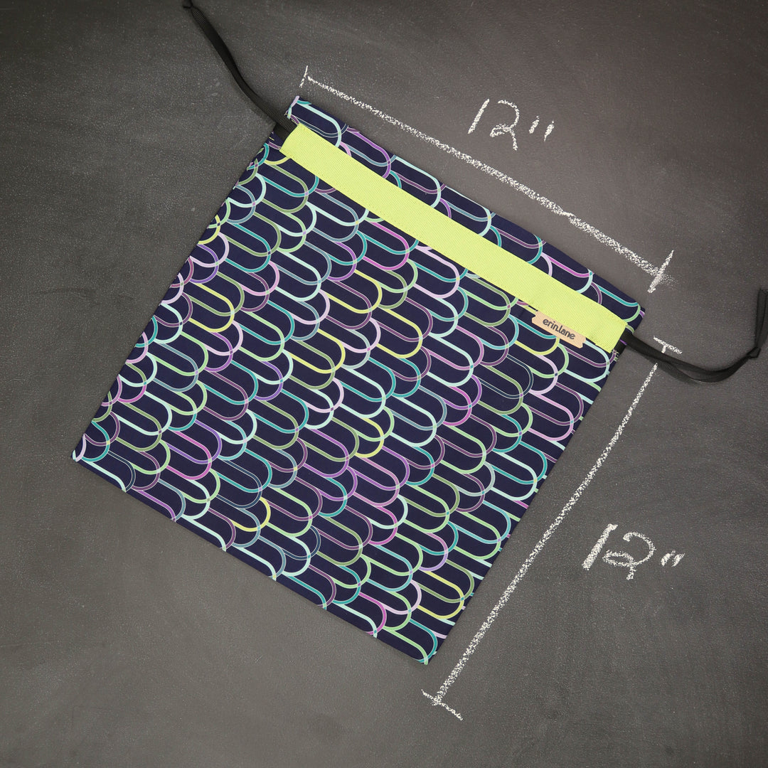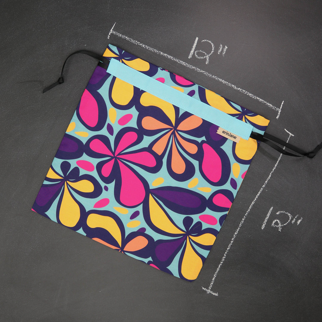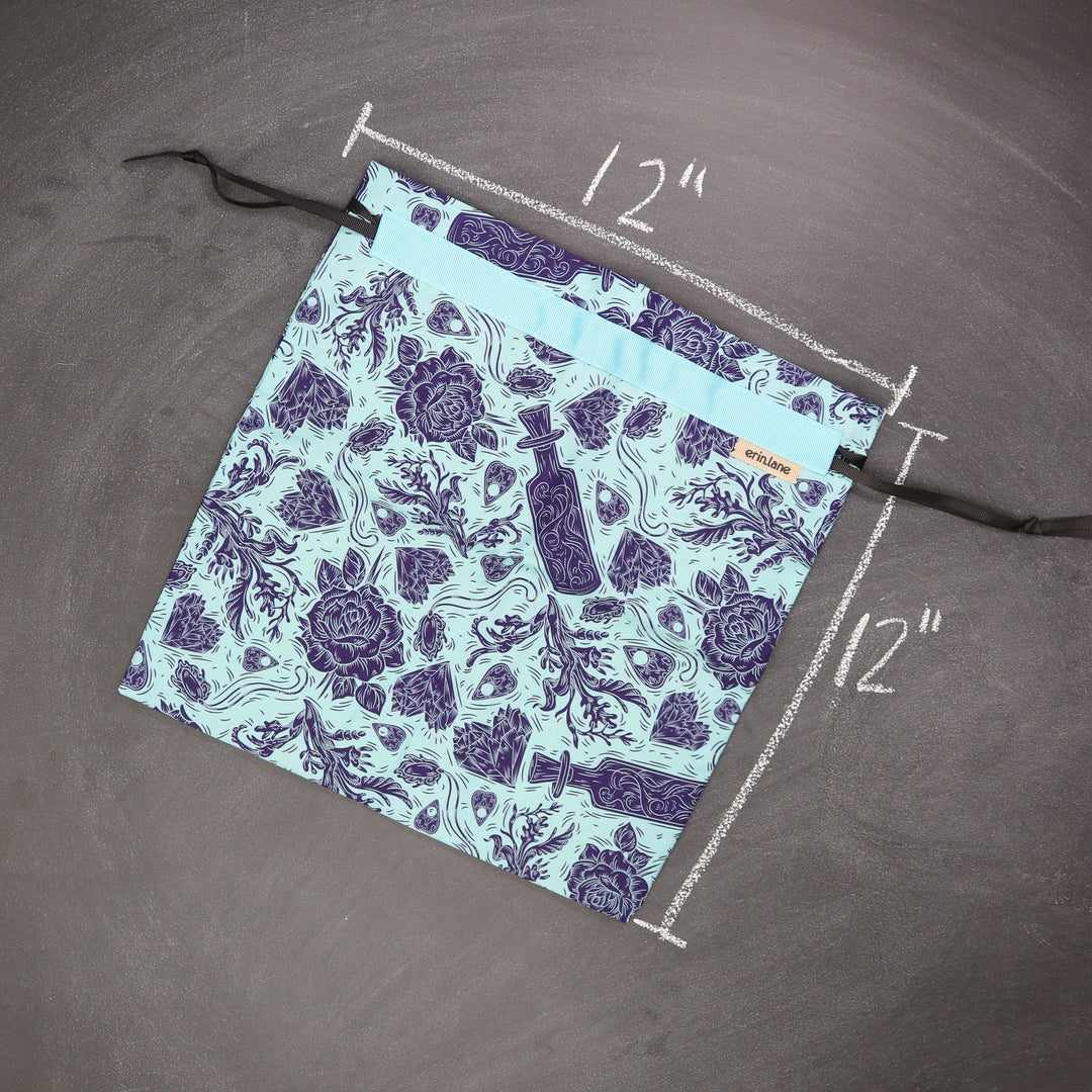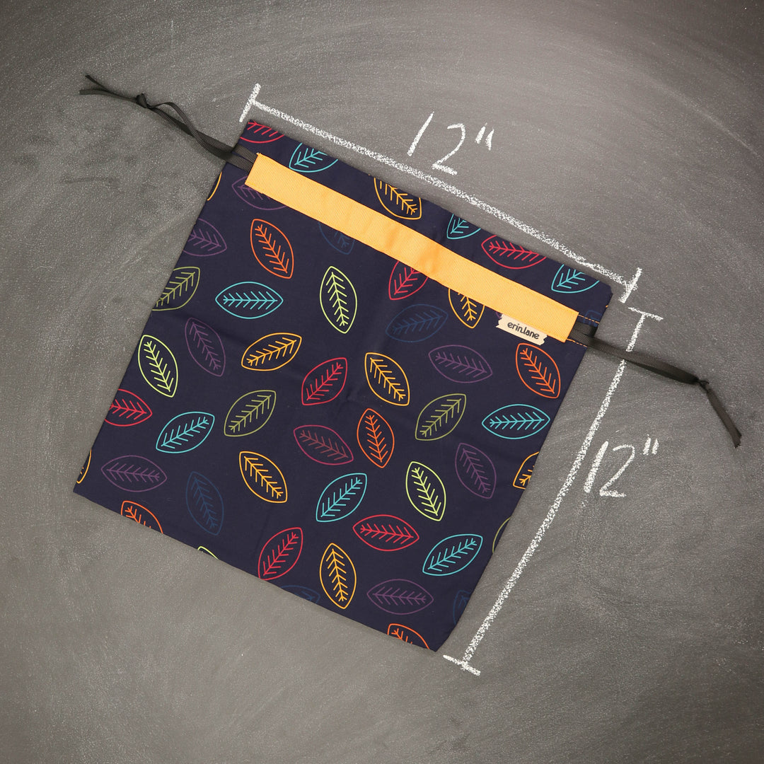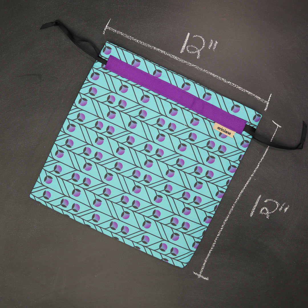 Our very first project bag. Measuring 12 X 12 inches, this flat folded bag is super versatile. Perfect for smaller projects like, hats, mittens, socks, scarves, cowls, and baby sweaters. This bag is great for a one or two skein project.