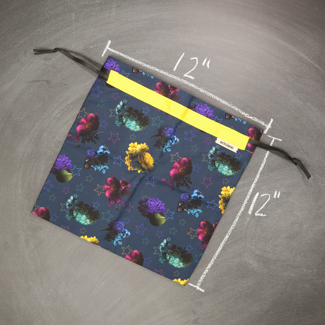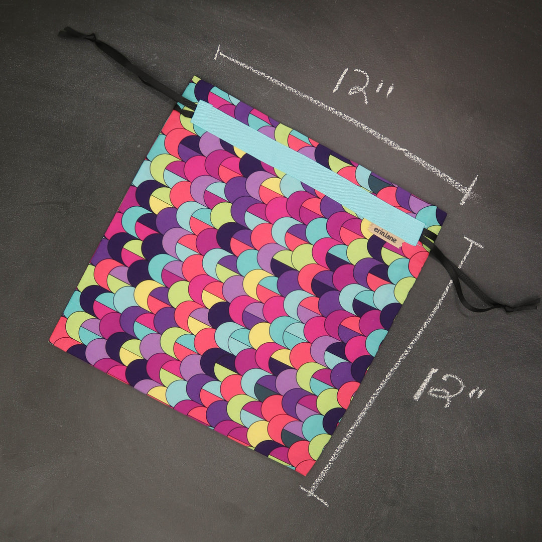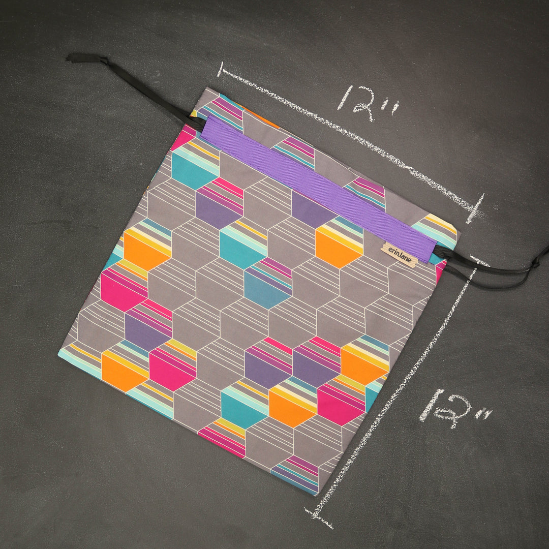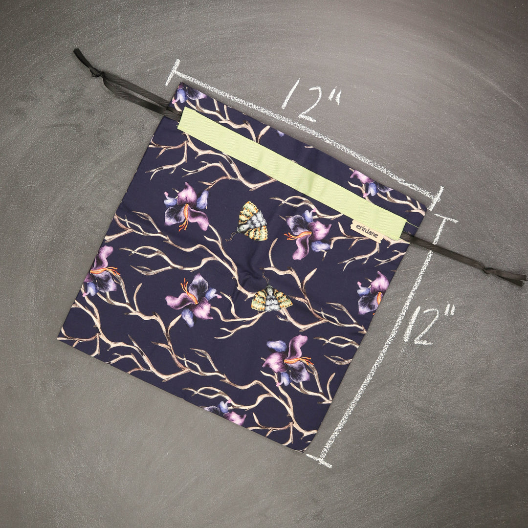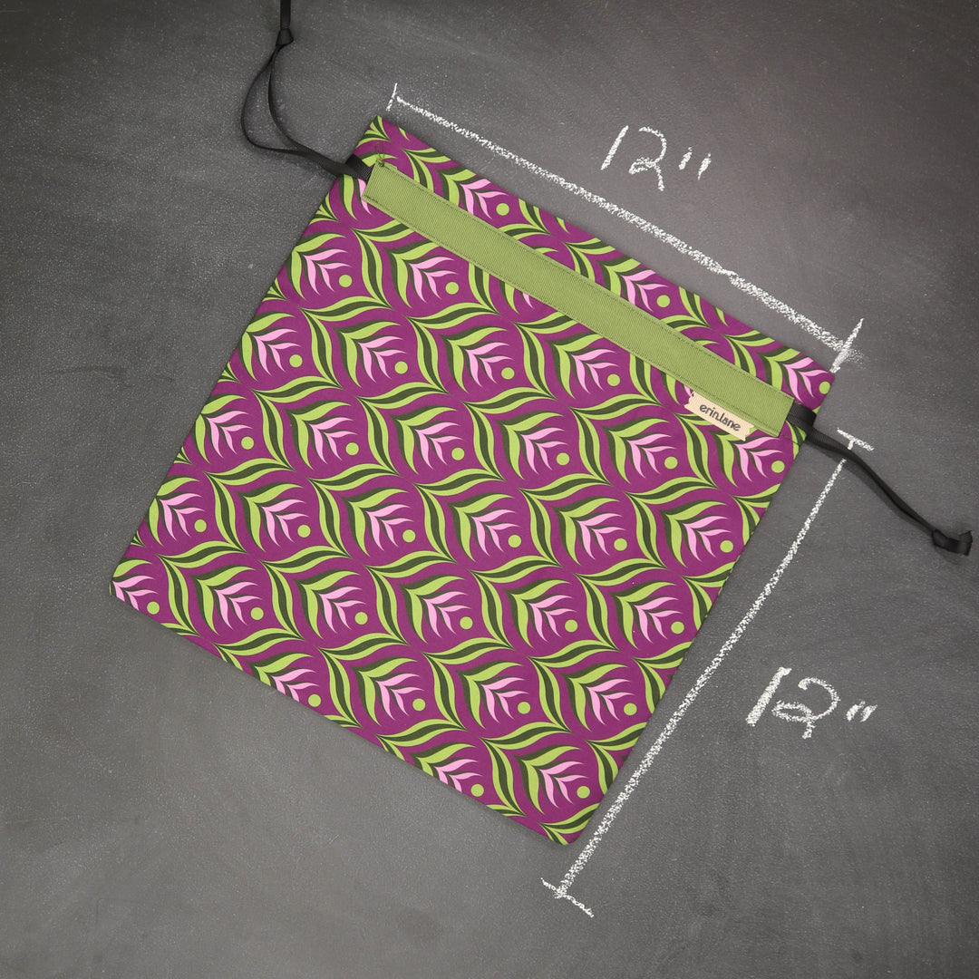 Our very first project bag. Measuring 12 X 12 inches, this flat folded bag is super versatile. Perfect for smaller projects like, hats, mittens, socks, scarves, cowls, and baby sweaters. This bag is great for a one or two skein project.