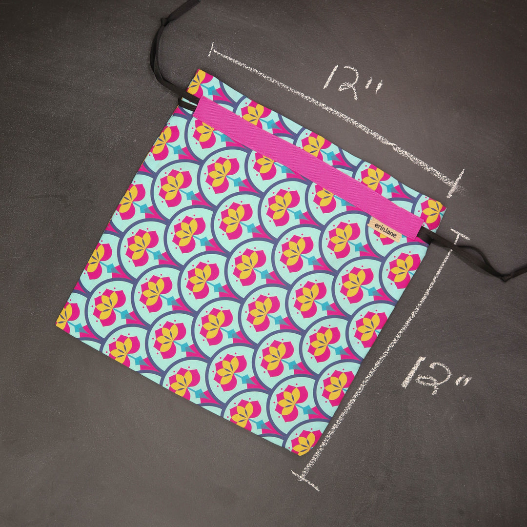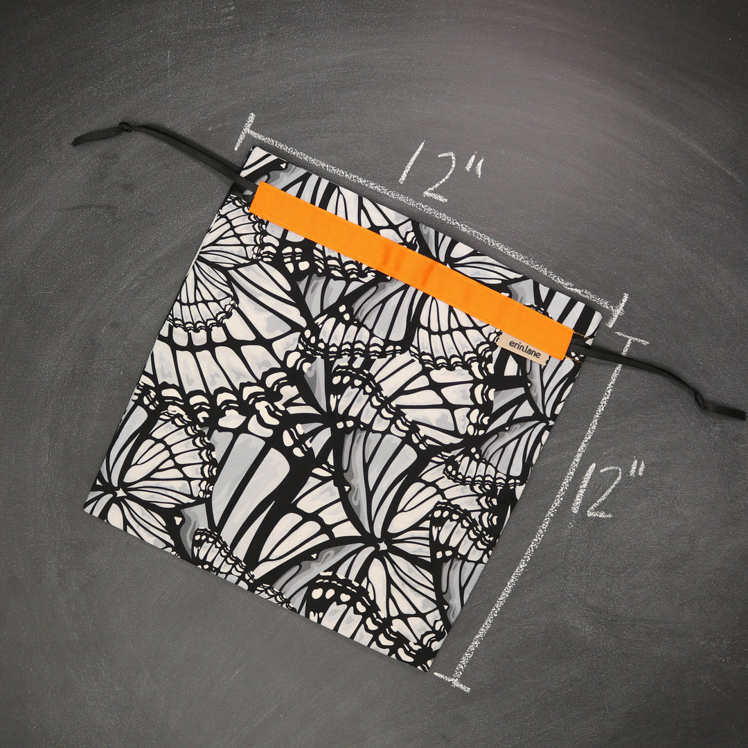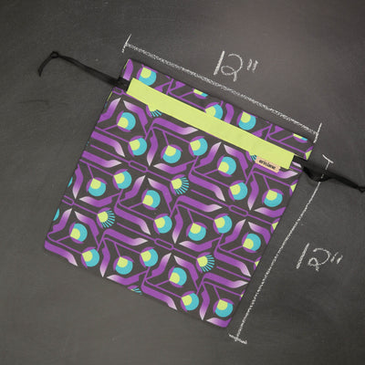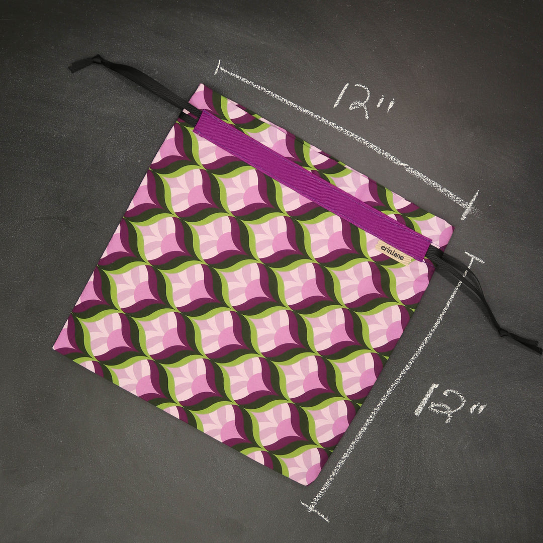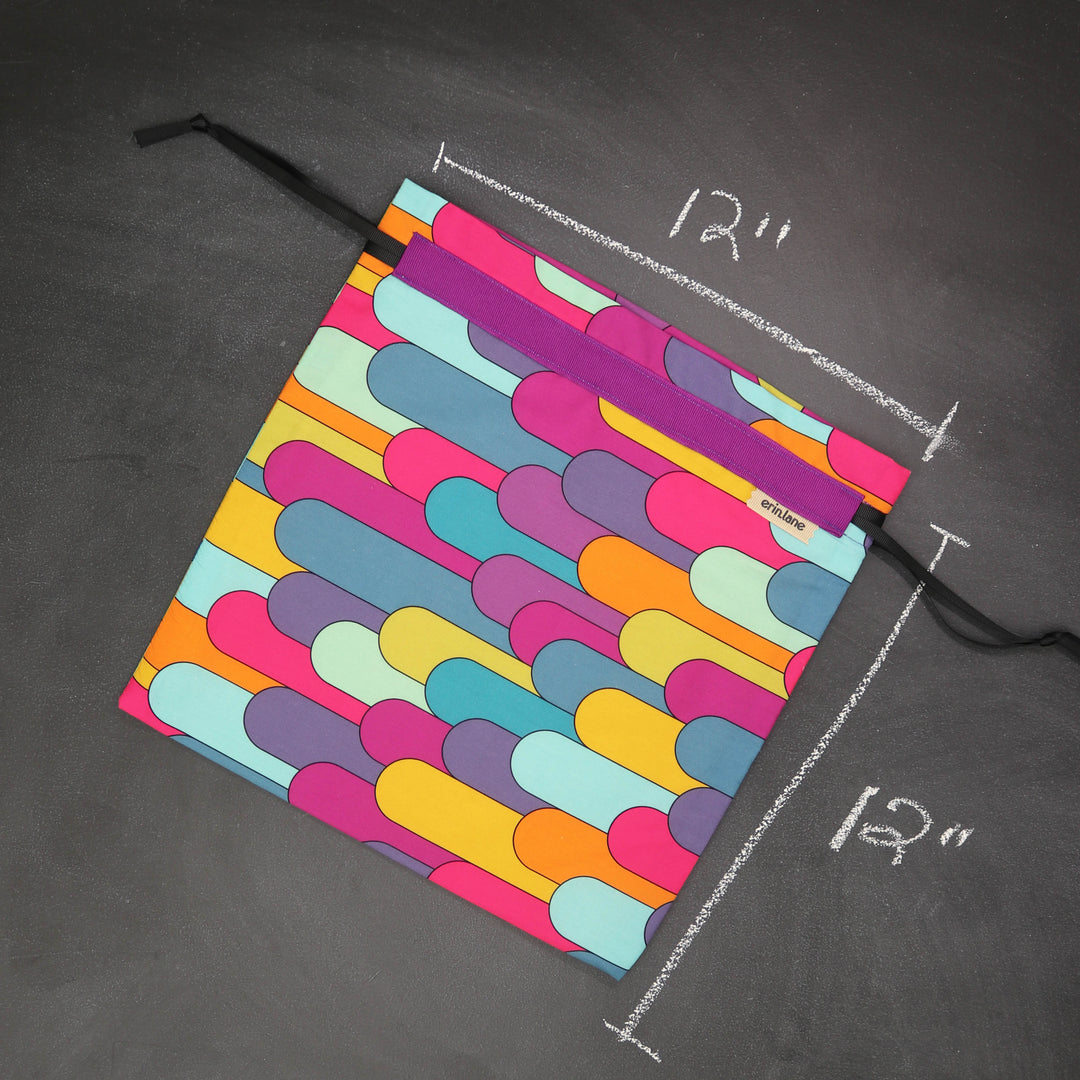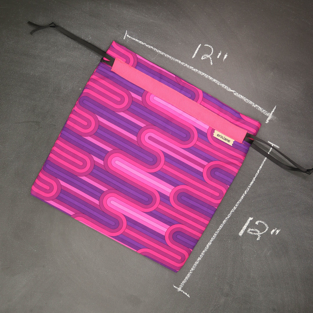 Our very first project bag. Measuring 12 X 12 inches, this flat folded bag is super versatile. Perfect for smaller projects like, hats, mittens, socks, scarves, cowls, and baby sweaters. This bag is great for a one or two skein project.