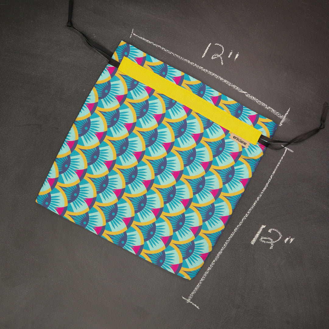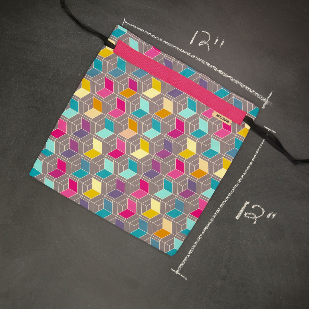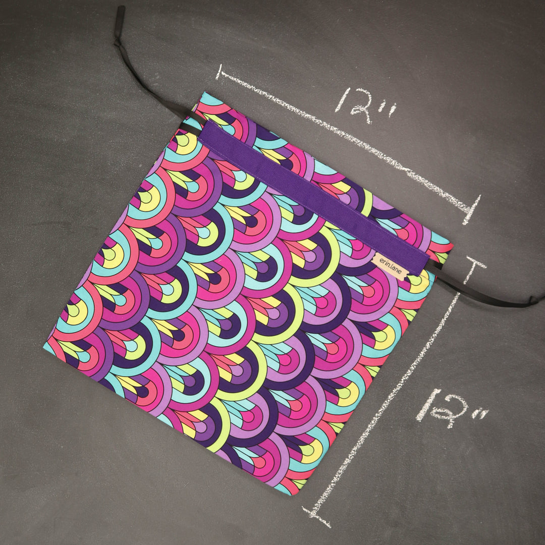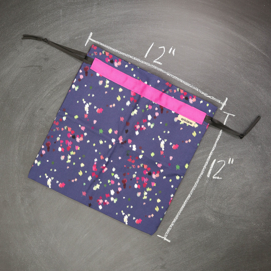 Our very first project bag. Measuring 12 X 12 inches, this flat folded bag is super versatile. Perfect for smaller projects like, hats, mittens, socks, scarves, cowls, and baby sweaters. This bag is great for a one or two skein project.