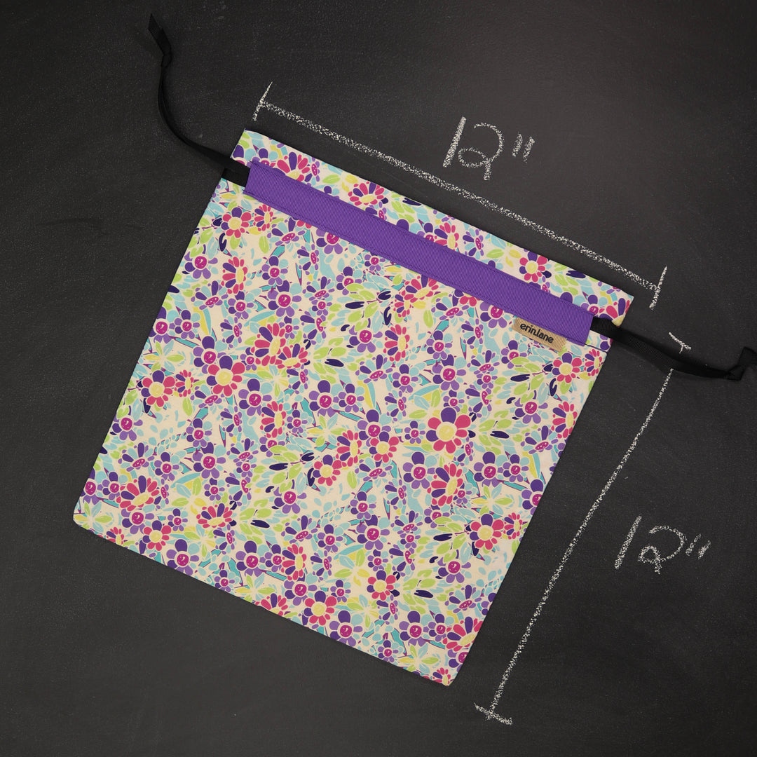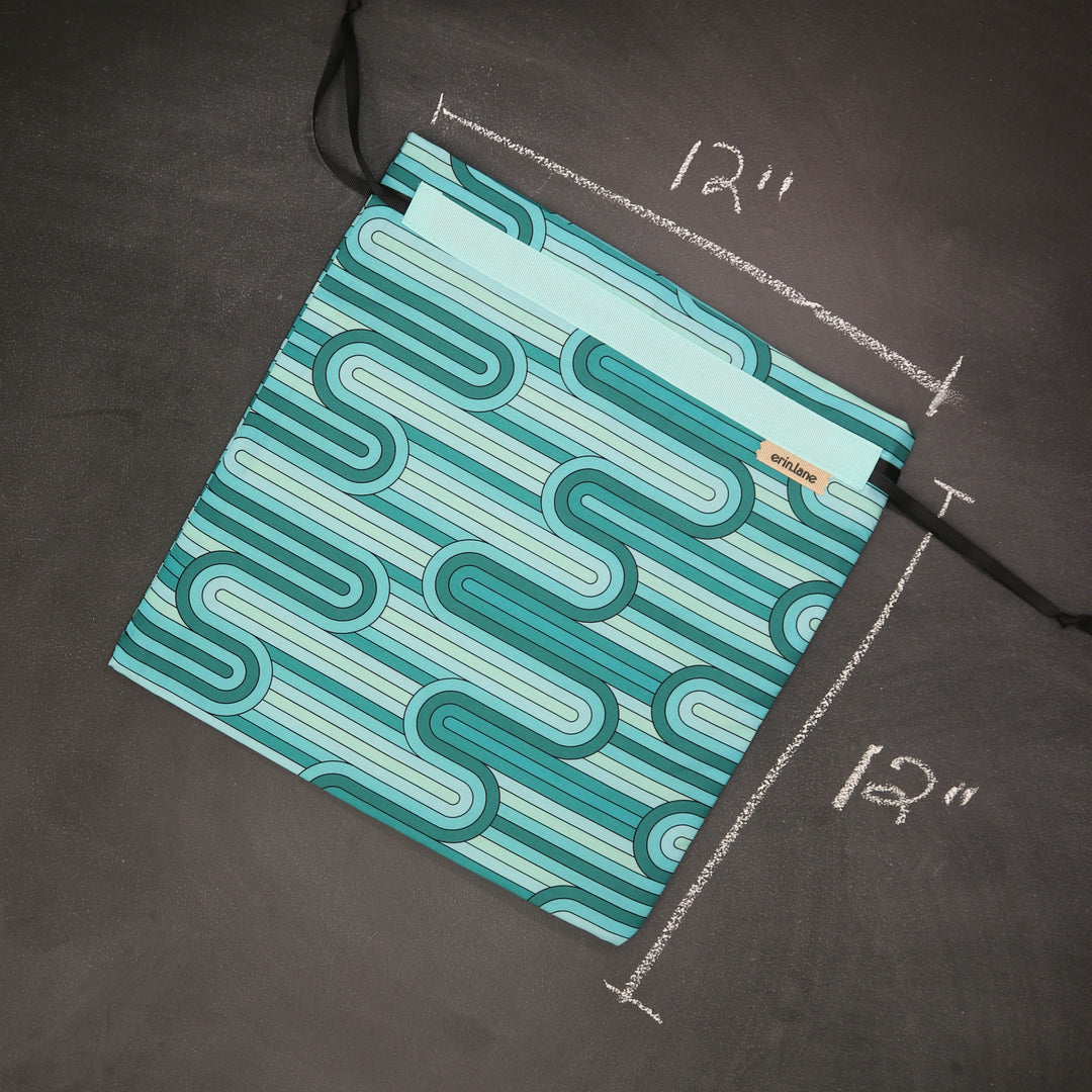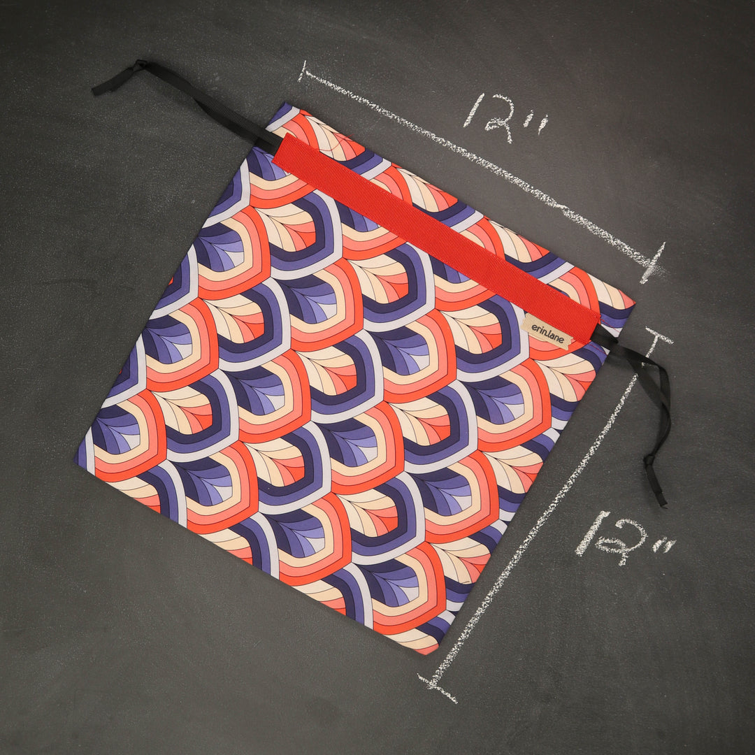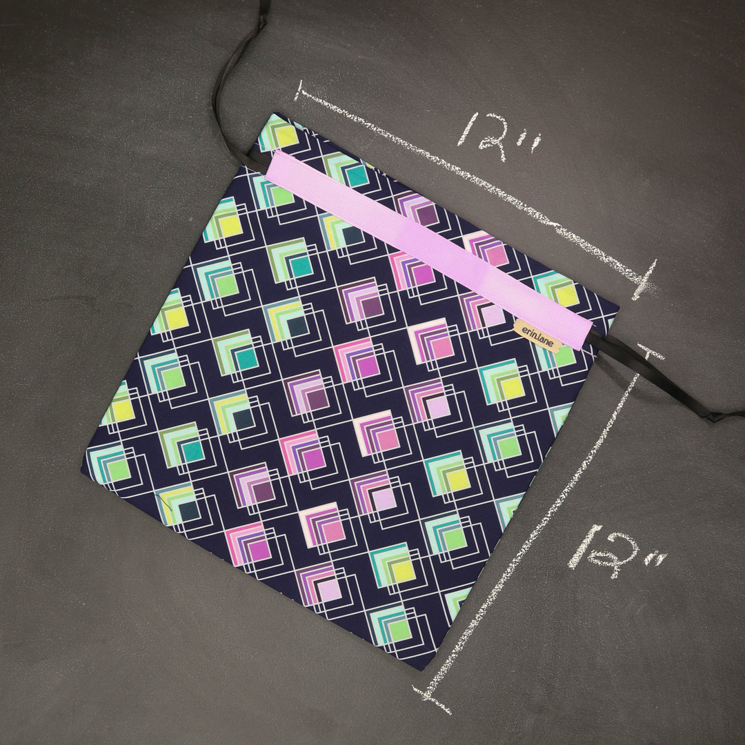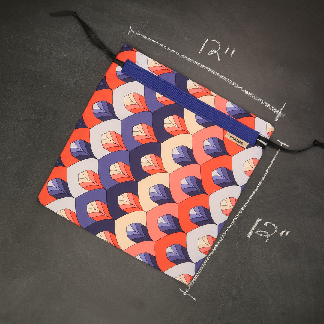 Our very first project bag. Measuring 12 X 12 inches, this flat folded bag is super versatile. Perfect for smaller projects like, hats, mittens, socks, scarves, cowls, and baby sweaters. This bag is great for a one or two skein project.