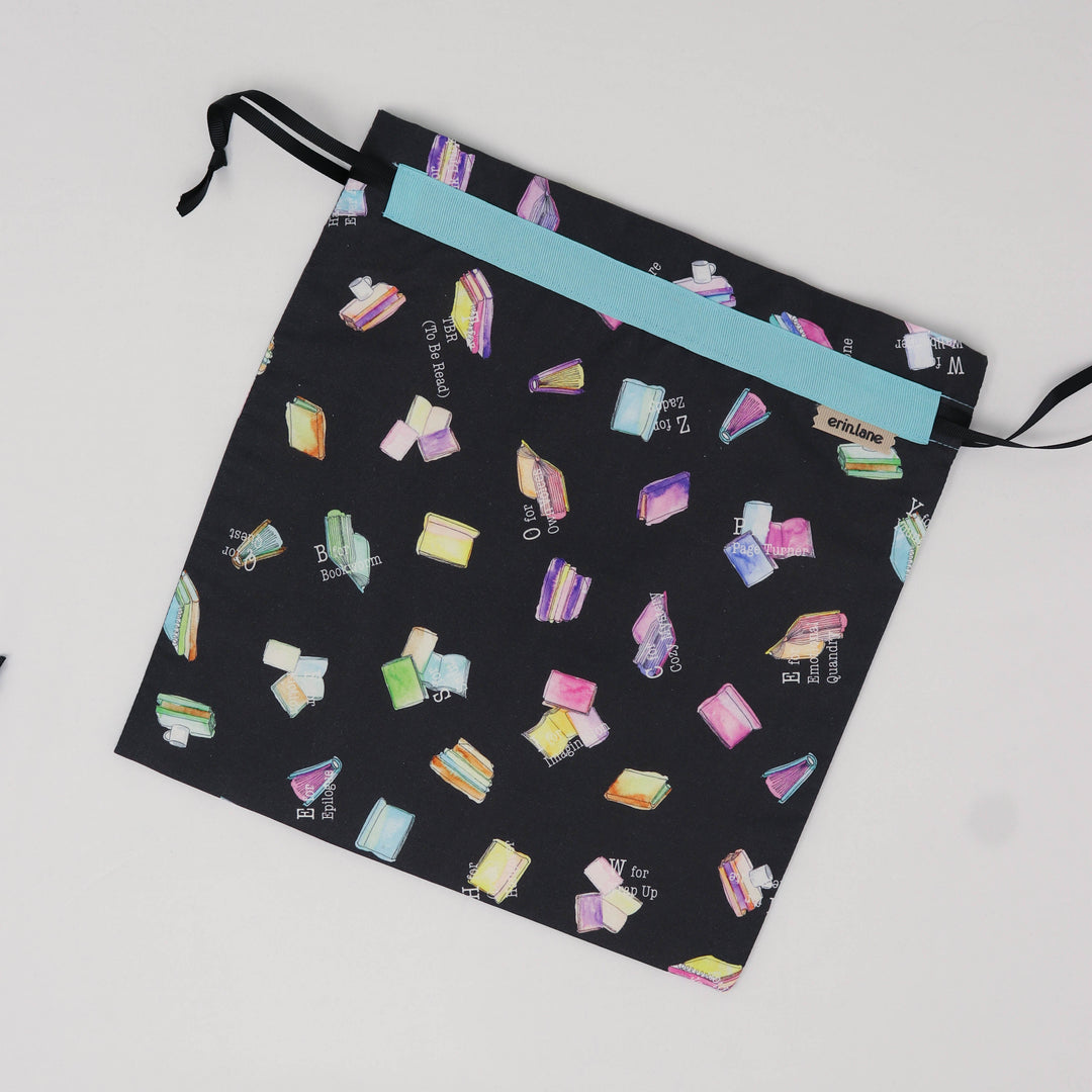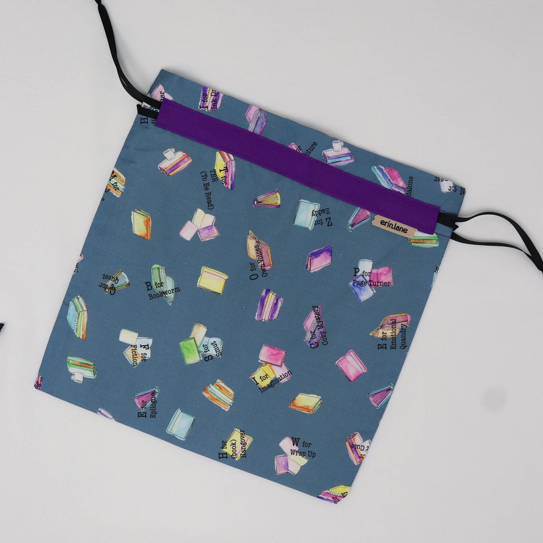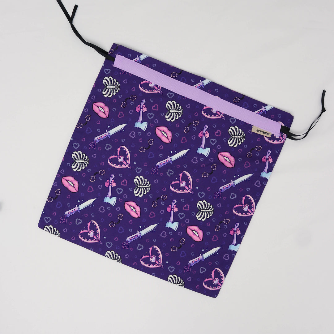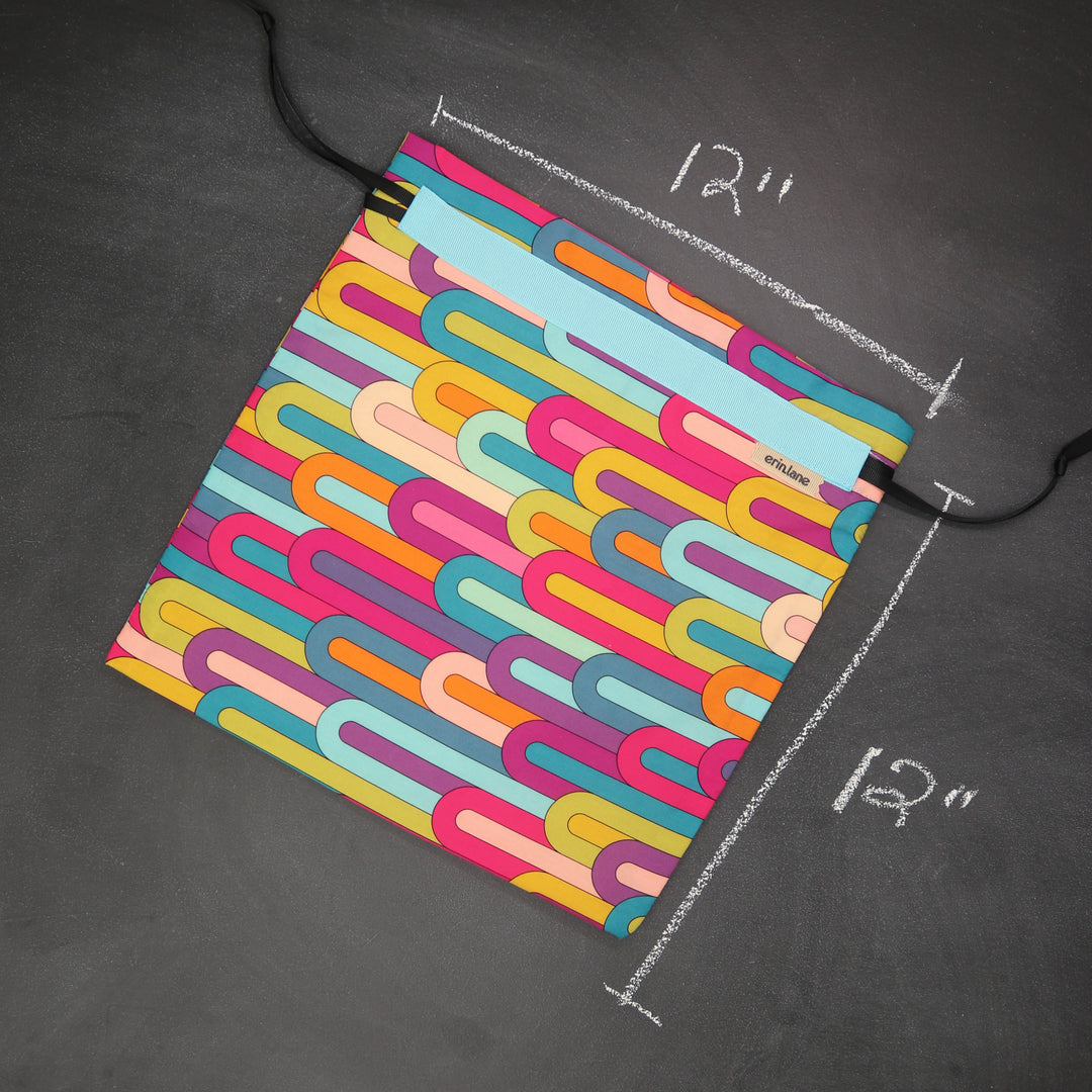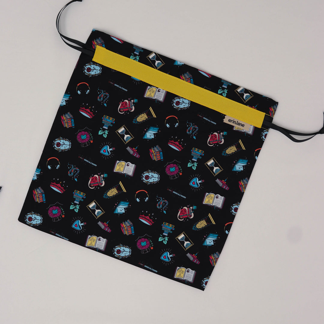 Our very first project bag. Measuring 12 X 12 inches, this flat folded bag is super versatile. Perfect for smaller projects like, hats, mittens, socks, scarves, cowls, and baby sweaters. This bag is great for a one or two skein project.