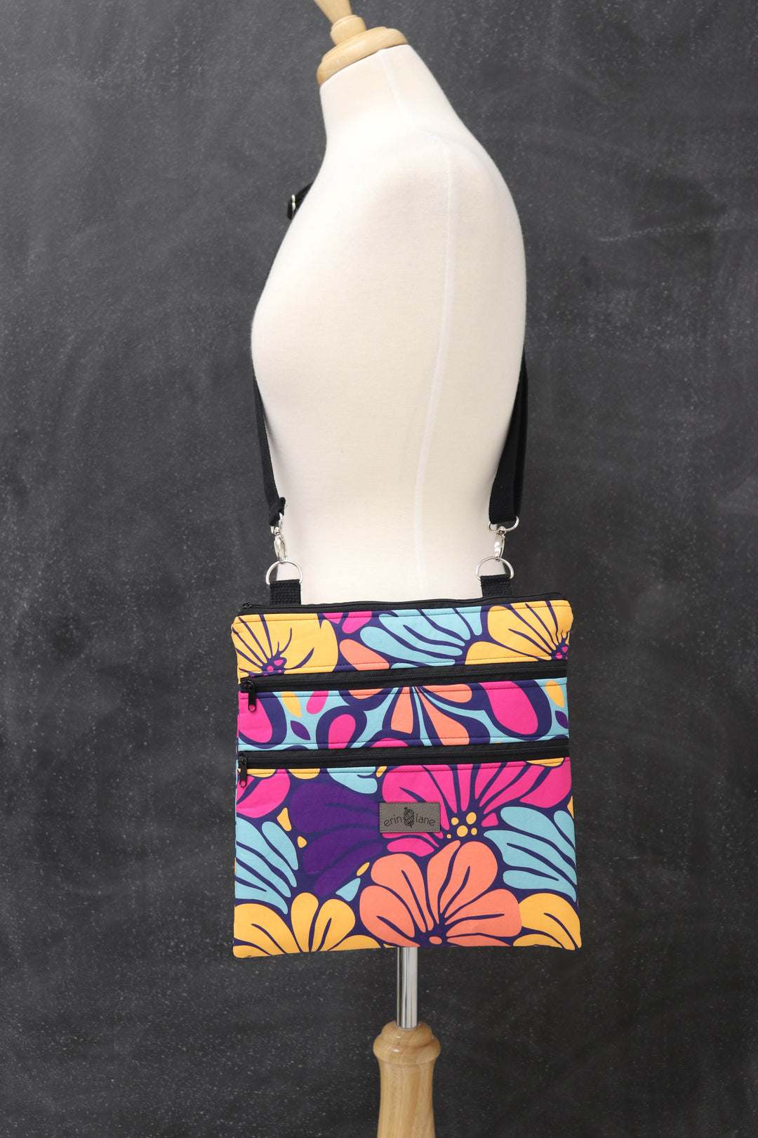 This crossbody bag features three zippered sections. The two front zippered pockets are great to keep you organized while out and about. The main opening of the bag is the zipper at the top giving you the most room for your goodies in the largest section of the bag. The front pockets are approximately 6 inches deep and span the full width of the bag.
