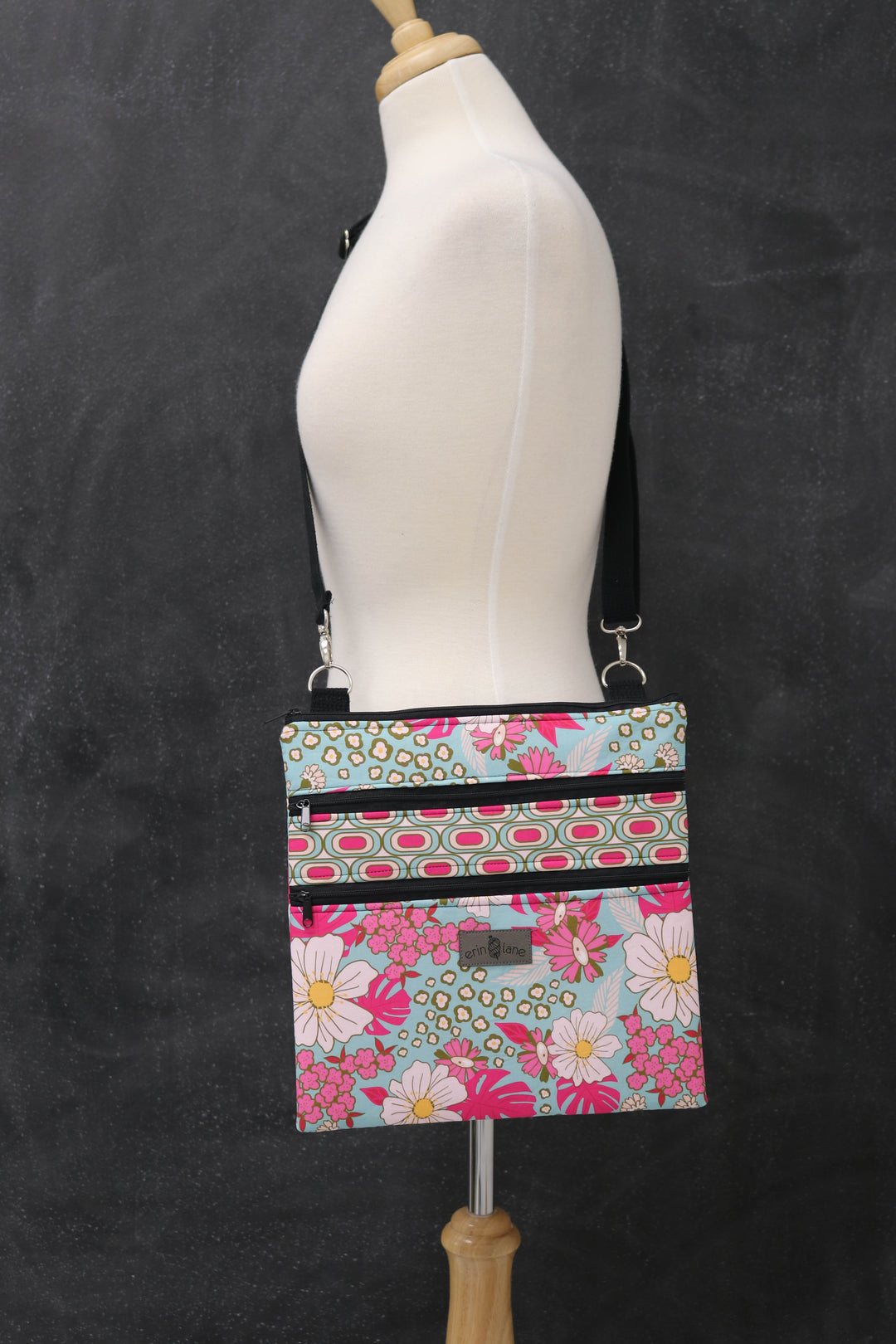 This crossbody bag features three zippered sections. The two front zippered pockets are great to keep you organized while out and about. The main opening of the bag is the zipper at the top giving you the most room for your goodies in the largest section of the bag. The front pockets are approximately 6 inches deep and span the full width of the bag.