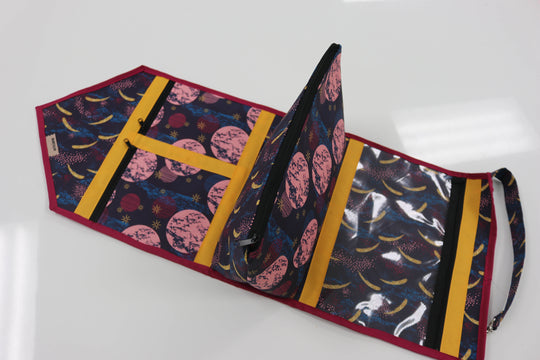 It opens up to reveal two zippered pockets for your tools and notions, a clear vinyl sleeve that’s perfect for folded patterns or travel documents, and a generously sized center compartment that fits your yarn, a small project, or even your toiletries. An adjustable magnetic closure keeps everything neat, no matter how much you're carrying. And with its sturdy handle, this tote is always ready when you are.