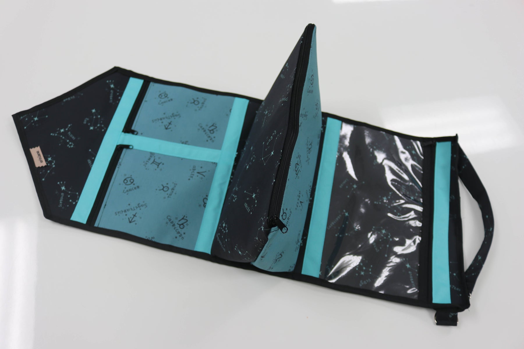 Fold-out organizer: Includes two zippered pockets and a clear vinyl sleeve for easy-access storage