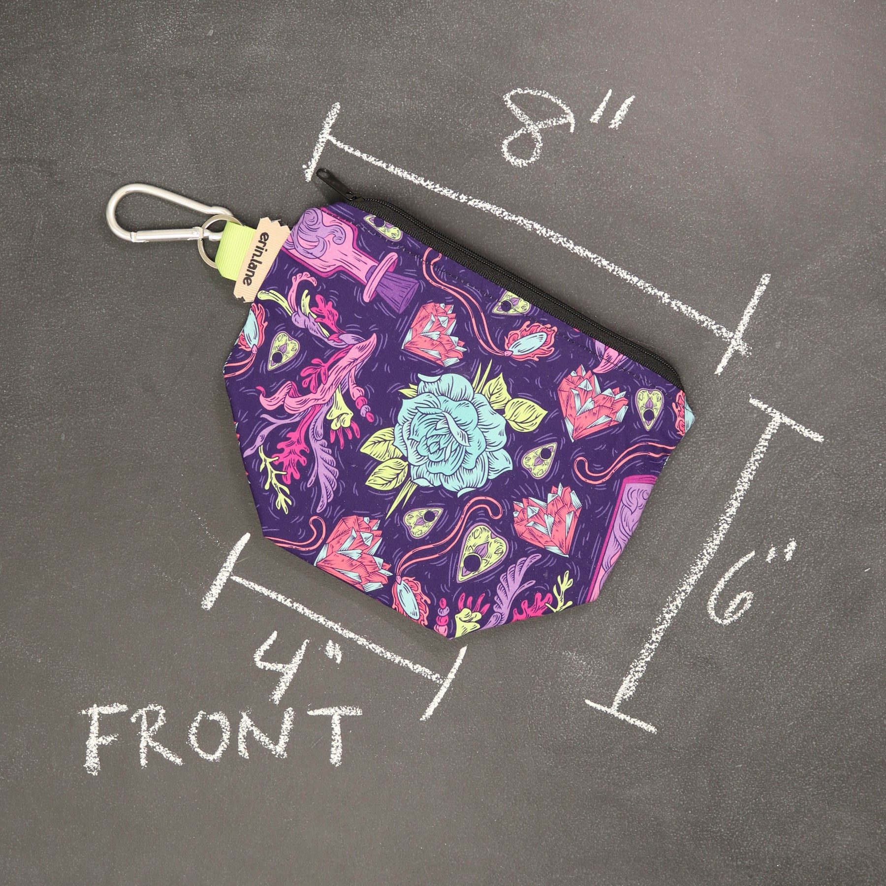 Sized at 8" x 6" x 4", it’s perfect for holding gaming dice, yarn notions, charging cords and blocks, travel toiletries, and any other small items that tend to disappear when you need them most. The #3 nylon coil zipper glides smoothly and won’t snag yarn, while a sturdy carabiner clip lets you hook it onto your backpack, project bag, or suitcase in seconds.