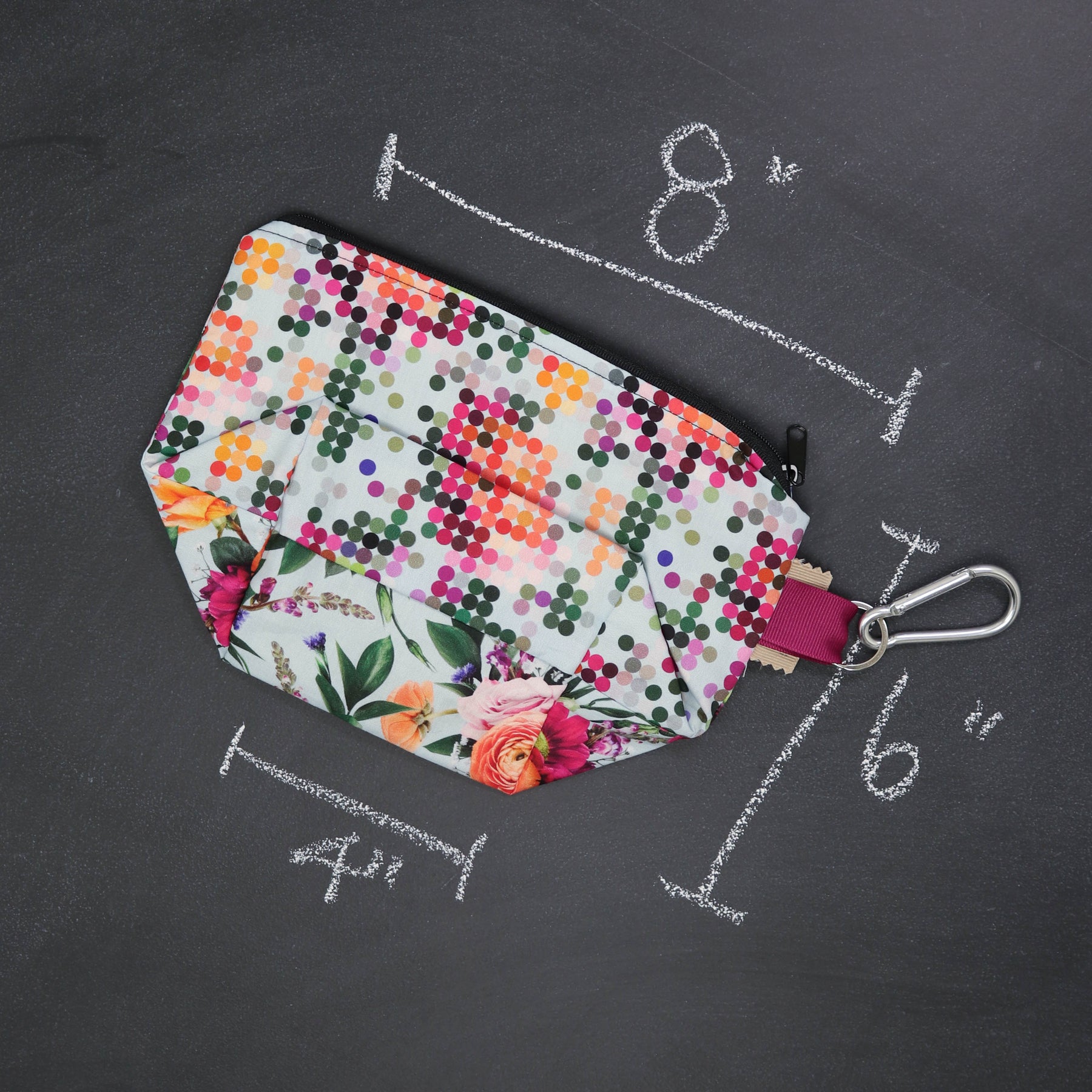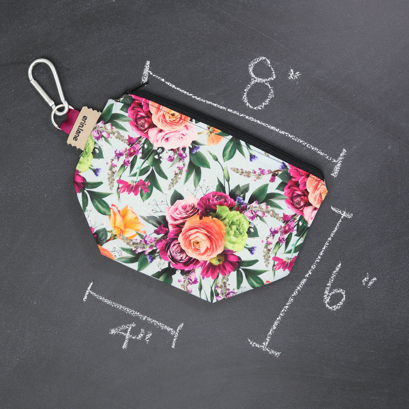 Measuring 8” X 6” X 4” this little bag is great for notions, charger cables, or anything you need to keep tamed and tidy. Featuring a study carabiner, you can clip this bag almost anywhere and stay not only organized but stylish as well. The #3 nylon coil zipper closes easily but the teeth are too small to snag your yarn. Because, happy yarn knits better.