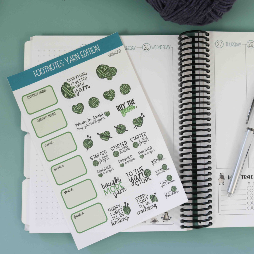 Is your planner missing a touch of creativity and whimsy? Our Footnotes Yarn Edition planner stickers are designed to help you celebrate and track your passion for all things yarn. Whether you're adding to your stash, attending a stitch night, or avoiding plans to indulge in your love for knitting and crocheting, we've got you covered.